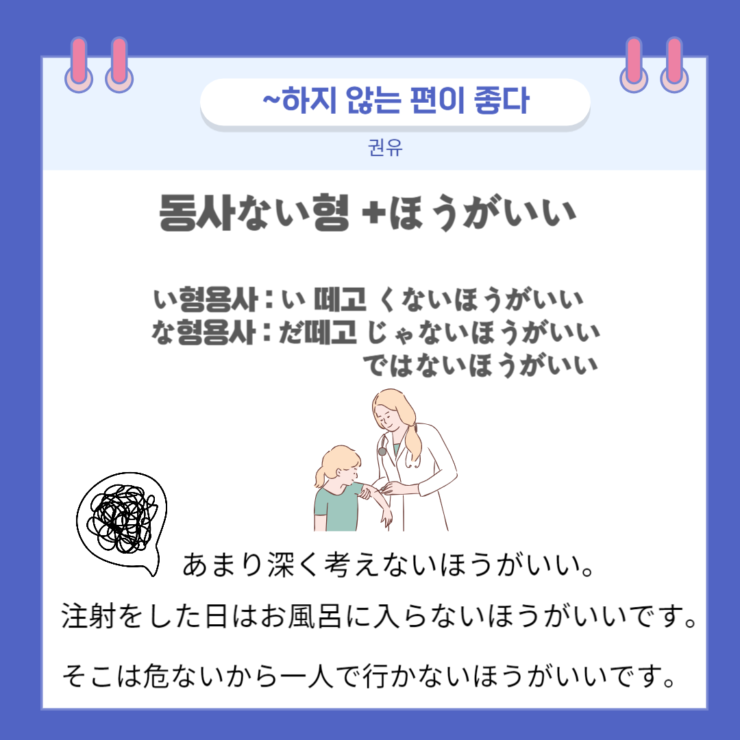 | 권유, 추천: たほうがいい ~(하)는 편이 좋다. (0) | 2023.08.07 |